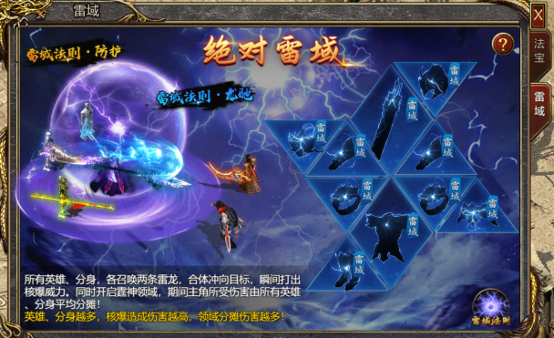 C. 超强buff绝对雷域,所有妖兽骷髅、分身都会召唤两条雷龙合体冲向目标,瞬间打出核爆威力。同时开启雷霆领域,期间主角所受伤害由所有妖兽骷髅和分身平均分摊